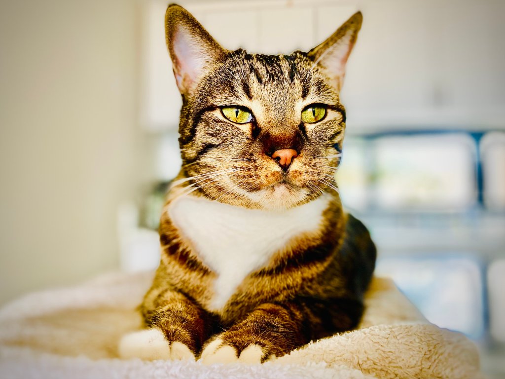 Kaya, the matriarch, presides over the household with calm authority. She’s the one who keeps everyone in order, but typically prefers a quiet cool corner or comfy bed to rest and observe. Her grumpy cat face is deceiving, because she loves to indulge in a morning cuddle.